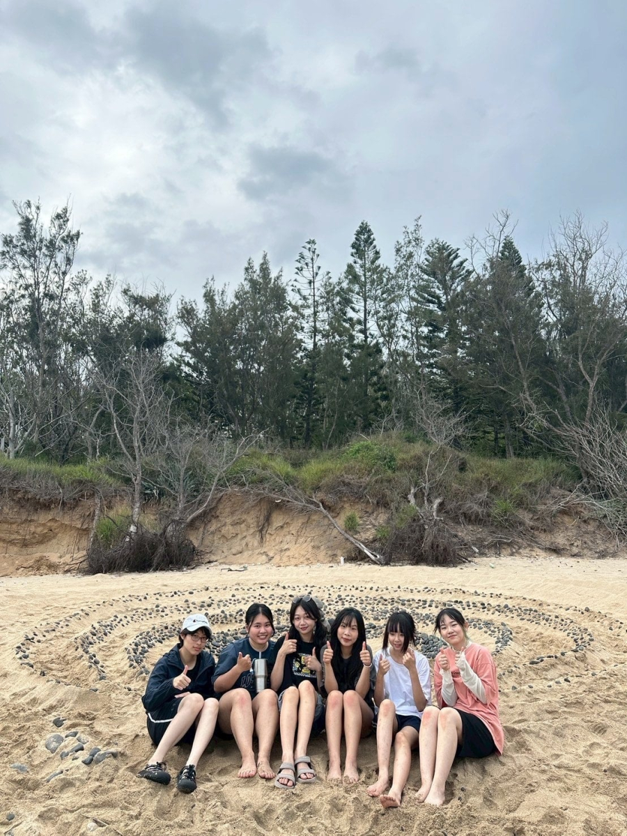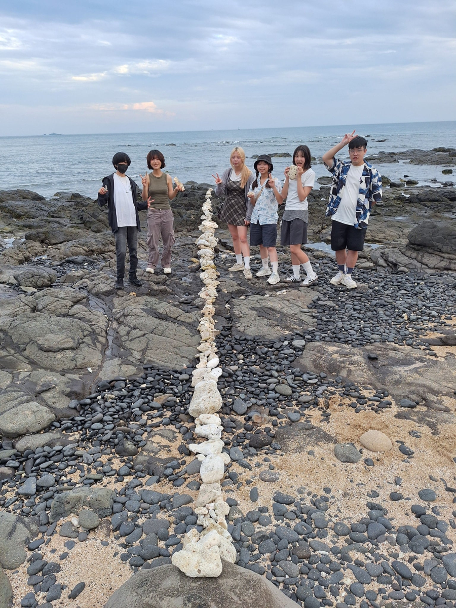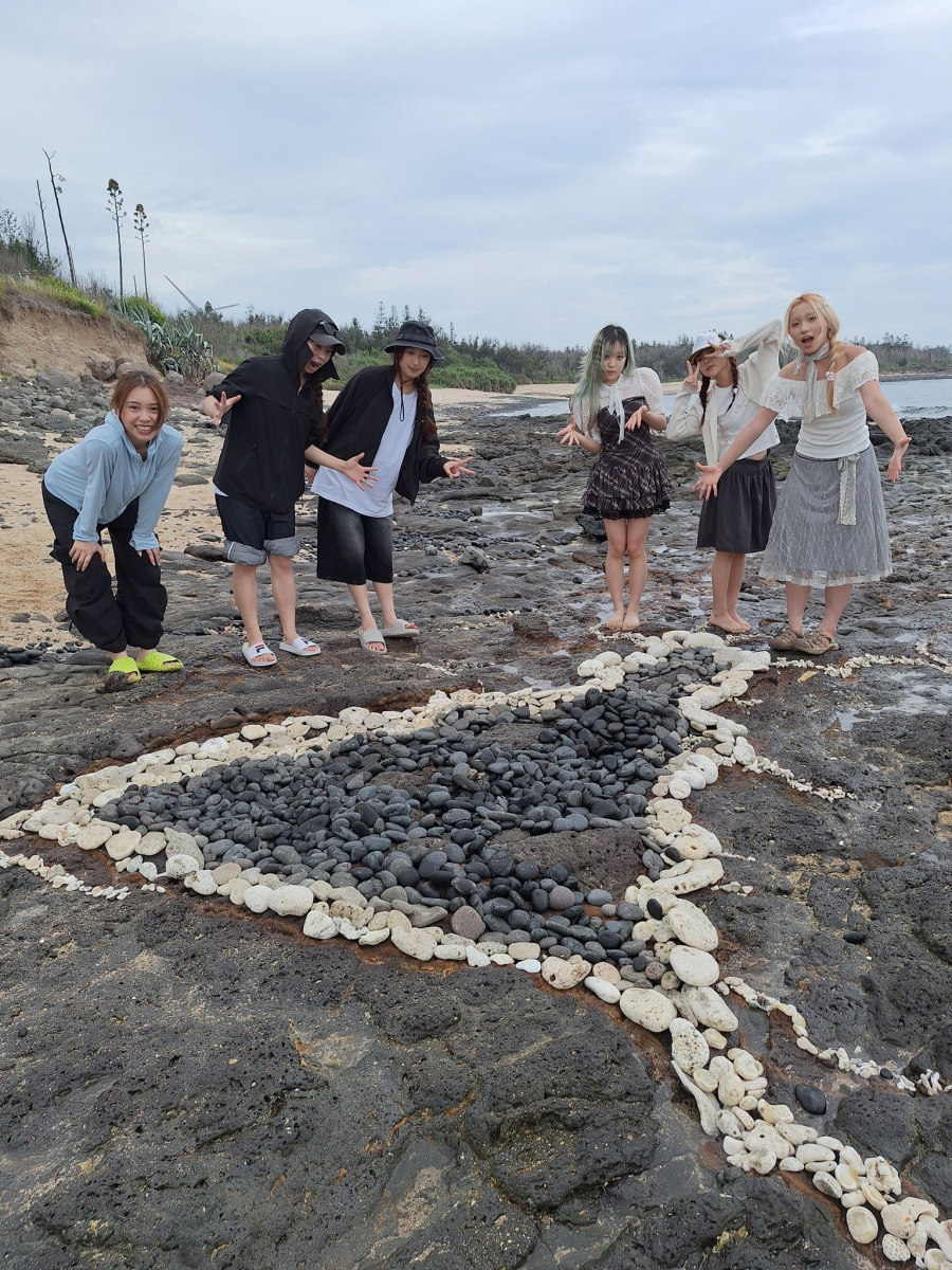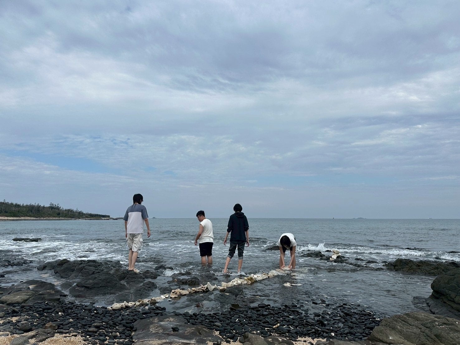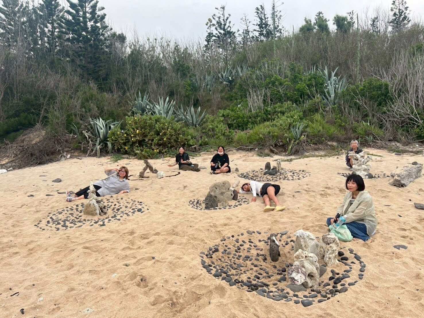 本系「複合媒體」課程於2025年5月初進行移地教學,由段存真老師帶領大學部2年級的同學們至澎湖海邊進行地景藝術工作坊。歷經十年的地景藝術校外教學,上山下海,曾經去過三義、台南、金山和澎湖等地海灘進行移地教學。今年在澎湖的裡正角海灘進行地景藝術活動,位置偏遠、人跡鮮少的裡正角沙攤,同時擁有岩岸、潮間帶、沙灘的多樣地貌,是適合做地景藝術的好地方。從場勘、發想、小組討論、現場執行製作,讓學生在歡樂的氛圍學習,在環境中尋找素材,實際完成地景藝術創作。