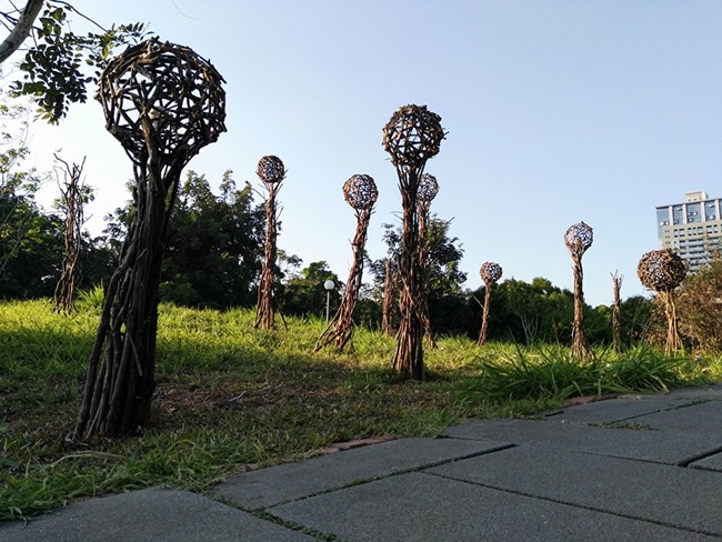 位於音美系館與管理學院間的作品「宇宙毛根」,象徵著一顆顆來自宇宙的種子,帶著岩石、泥土和愛降落到地球
