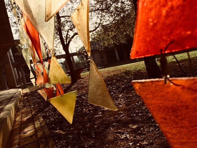 「暖洋」使用染色的草繩一條條黏結編織而成,在音美系館的空橋下,像是一片安靜沁涼但也最溫暖的海