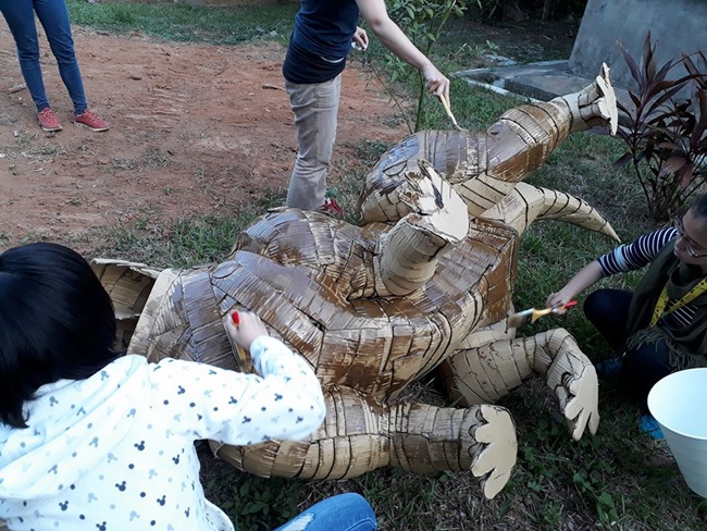 We make康嘉倫表示:「在瓦楞紙版上做裝置不容易,短時間教導學員一同創作更是一大挑戰」,仿生三角龍不僅型態擬真,悍氣逼人,接上電路後,獸嘴可開啟,眼瞼可上下開闔,龍尾能左右擺動,眼球還能瞬間轉紅。完美的成品全得力於學員一開始胼手胝足,協力裁切了瓦楞紙箱替巨龍打造等比例的身體骨架,搭設仿生獸軀幹;獸體內搭設了電子晶片,賦予了三角龍靈魂,最後又替龍身刷上色彩,讓整隻巨型仿生獸栩栩如生的滿分程度又再增添幾分。