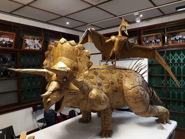 講師鍾凱翔更提到:「這次瓦楞紙大型紙塑作品的課程不管是學習Arduino的程式機械控制組還是紙塑造型組皆十分認真且團結,並妥善分工且扎實操作自身該負責部份,才能在短時間內完成一件結構、造型、動態和機械動力裝置上都有水準的作品,是一次愉快又富成就感的教學經驗」。課程本身不只內容充實豐碩,上課形式也是有趣不帶壓力。另外,講師也回饋大方加碼,再奉上一隻同樣逼真生動的仿生翼手龍。兩樣大型仿生獸作品於11月10日起在東海大學產學大樓一樓創拓聚落展出。