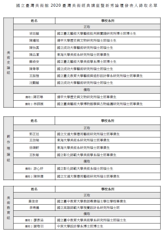 國美館「#2020臺灣美術經典講座暨新秀論壇」發表人錄取名單揭曉