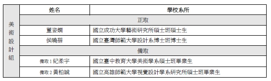 本系畢業研究生陳品潔、王信瑜、徐靖軒等3位獲得正取,而另一位獲選「美術設計組」的董姿嫻為本系大學部系友。