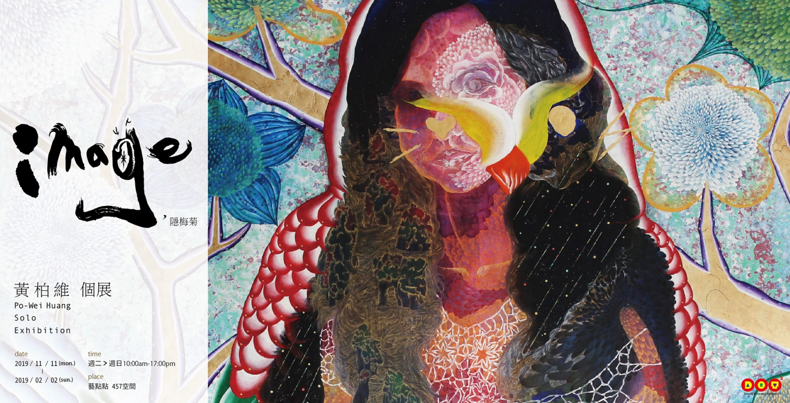 本展主題【隱梅菊 Image】,藝術家黃柏維以「Image」之諧音譯為「隱梅菊」,作品以菊花作為本體呈現於畫面的敘事性。技法巧妙運用複合媒材,細看作品亦有不一樣的詮釋。