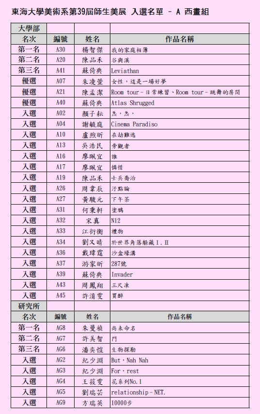 本系第39屆師生美展得獎名單!!恭喜各位得....