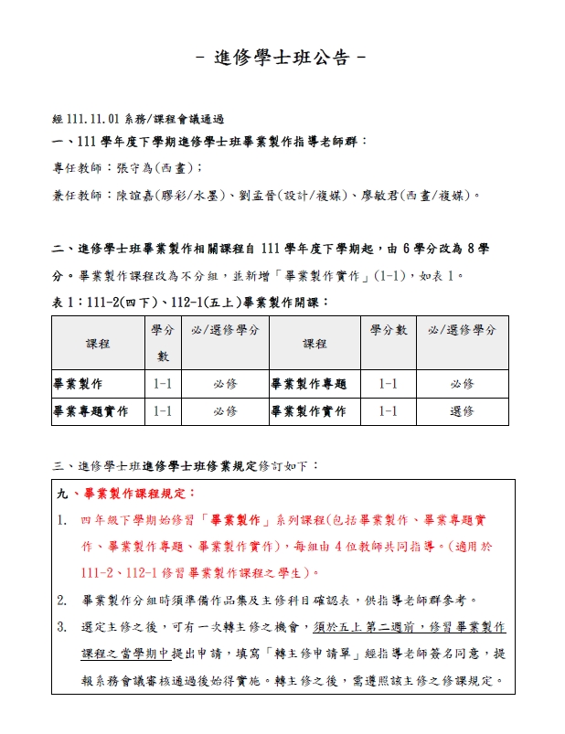 美術系進修學士班公告