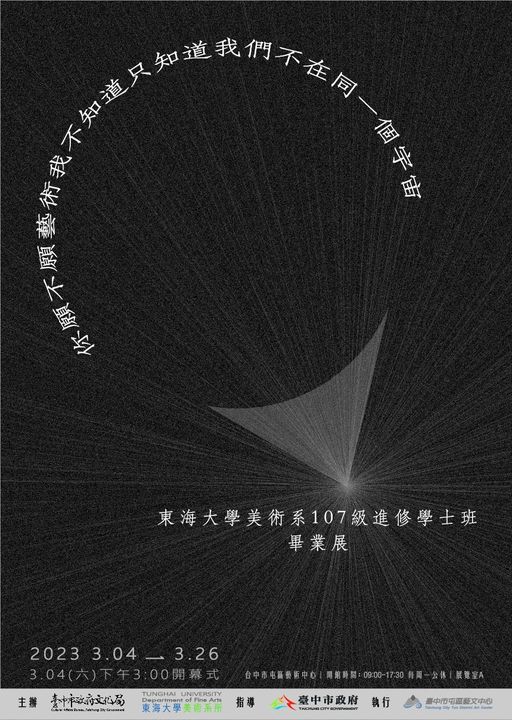 「你願不願藝術我不知道,只知道我們不在同⼀個宇宙」東海⼤學美術系進修學⼠班107 級畢業展,展出64 件作品,將於 112 年3⽉4 ⽇⾄3 ⽉26⽇在屯區藝⽂中⼼展覽室A展出;開幕典禮訂於3⽉4 ⽇下午3 時舉⾏,誠摯邀請各界指教並共襄盛舉。