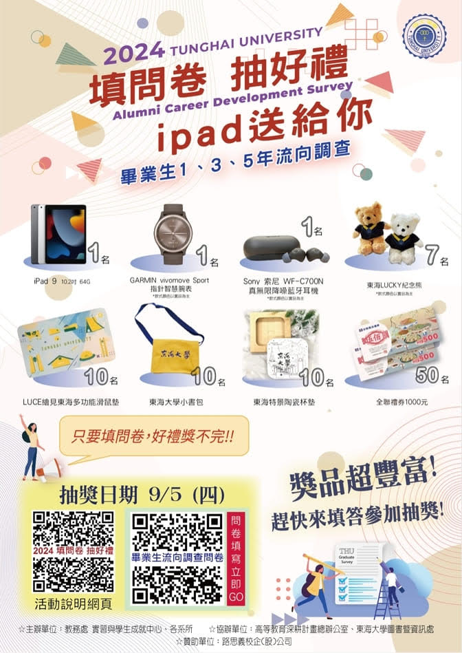 ※9/5(四)進行抽獎,iPad、GARMIN智慧腕錶、SONY 藍芽耳機、東海紀念熊、全聯禮券、東海小書包等獎品等你帶回家!
