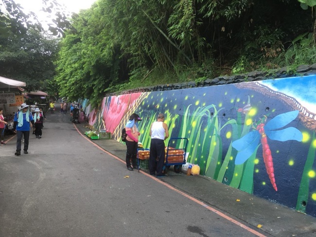 大坑步道近期著手進行一連串的修建整頓,九號步道入口處的檔土高牆,原有的老舊帆布廣告即將要拆除,因此該管理單位請來本校美術系同學,在牆上手繪大坑步道風景特色及在地生態意象,彩繪成色彩繽紛百米長牆,長牆上有高山、彌猴、飛鳥及在地農作,讓人有煥然一新的感覺。