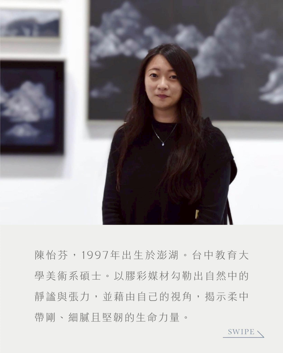 陳怡芬,1997年出生於澎湖。以膠彩描繪夜色中的草木與自然風景,探尋潛藏於黑暗中的生命律動。她刻意捨棄城市符號,以黑白灰的極簡色調營造出靜謐張力,讓觀者進入內省的深夜時分。