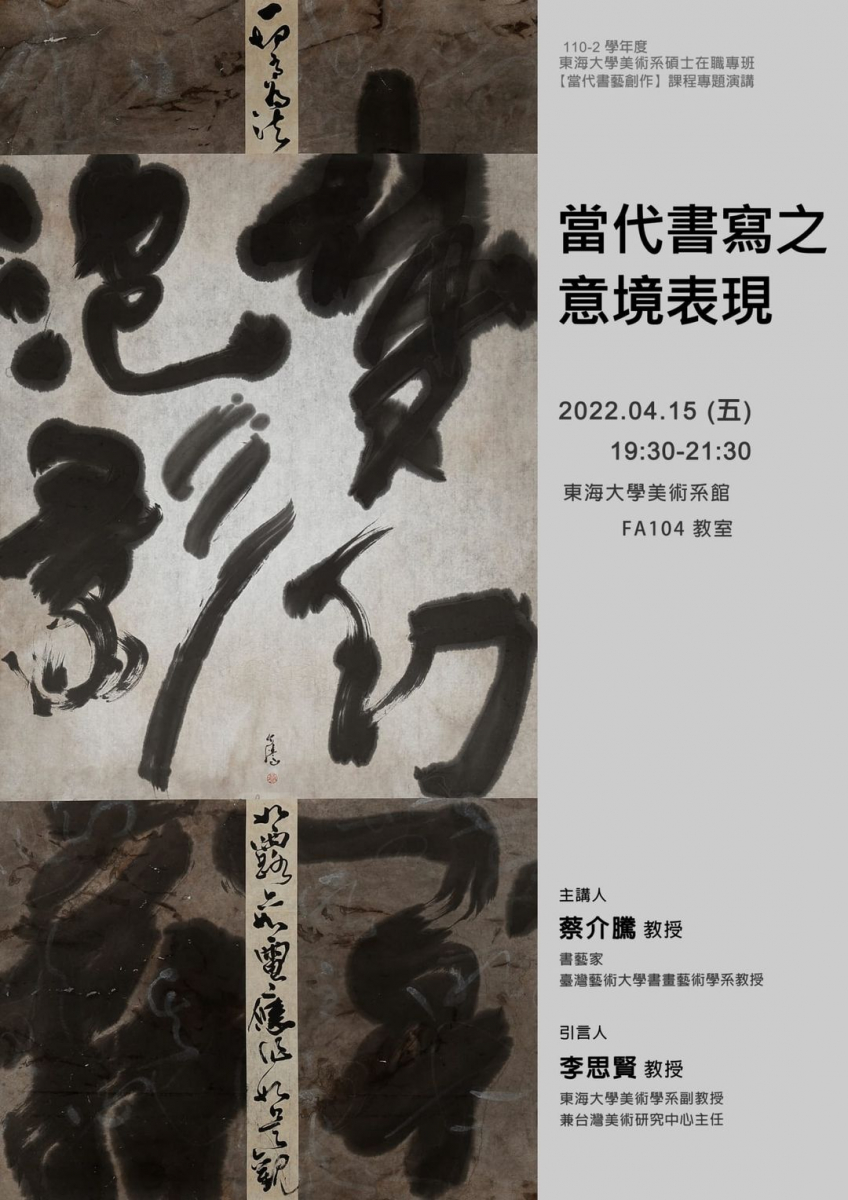 東海大學美術系TUNGHAI UNIVERSITY DEPARTMENT OF FINE ARTS-新訊與活動-系所記事-演講訊息 |當代書寫之意境表現 蔡介騰 教授(書藝家,臺灣藝術大學書畫藝術學系教授)