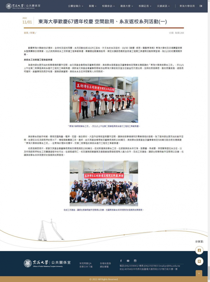 為提供師生更充裕的教學環境與實作空間,由文英基金會周瑜芬董事長捐款,美術學系發展基金及董事會核定預算支應興建的「東海大學美術學系工坊」,於11/1上午在第二教學區美術系進行工程完工奉獻典禮。捐款者文英基金會董事長周瑜芬由東海大學前就友室主任劉益充代理出席,並與校長張國恩、副校長詹家昌、總務長柯耀宗、創藝學院院長許和捷、建築師黃豐國、美術系系主任李思賢等人共同剪綵。